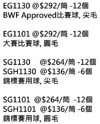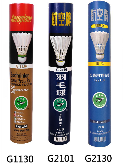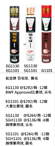 航空牌一筒十二個 G1130尖毛及G1101圓毛特價 $184 四級鵝刀翎球 G2130尖毛及G2101圓毛特價 $140 |
